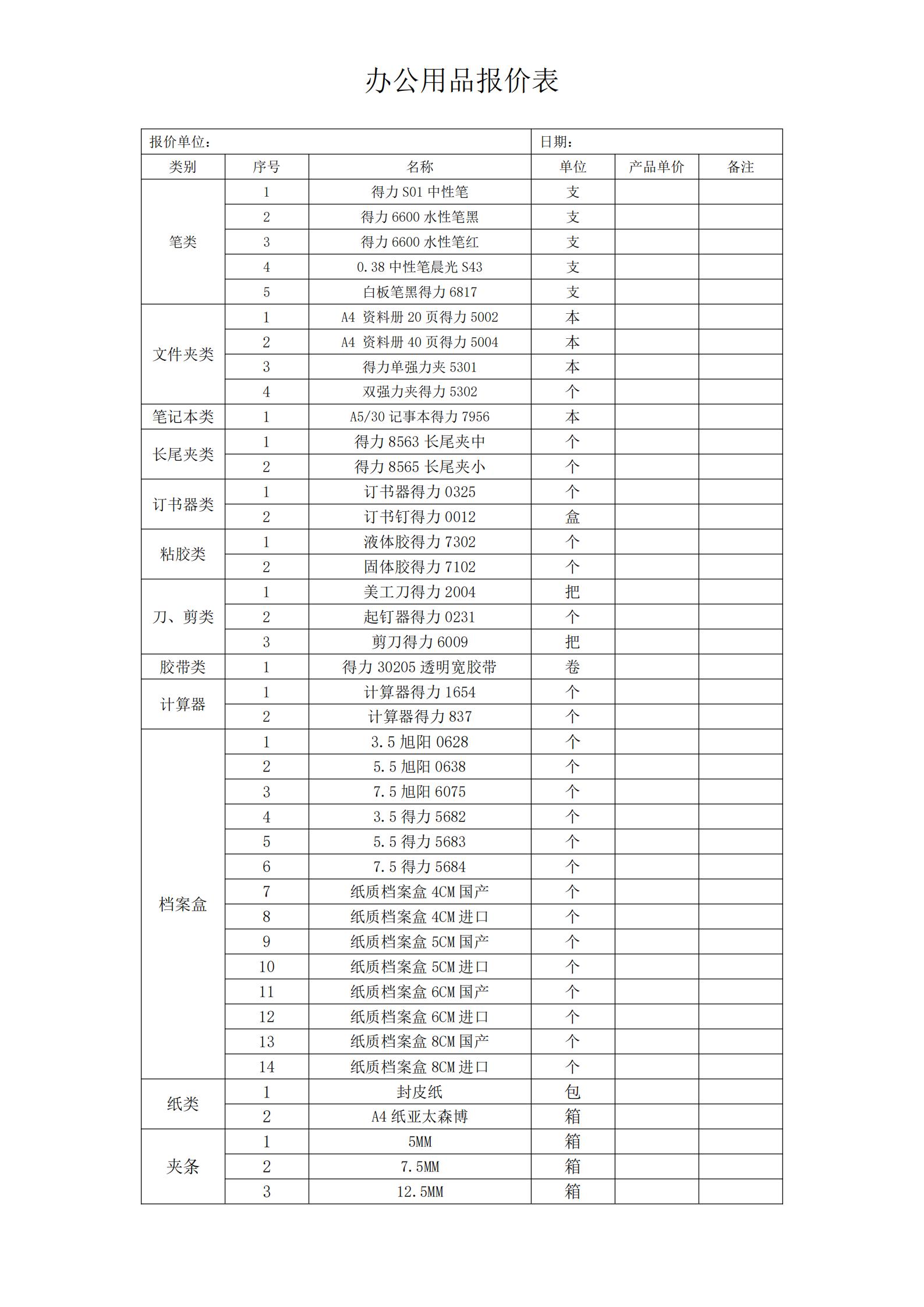 5.評(píng)選標(biāo)準(zhǔn):供應(yīng)商需按照公司辦公用品采購(gòu)清單進(jìn)行報(bào)價(jià)。報(bào)價(jià)需包括產(chǎn)品價(jià)格、交貨期、增值稅專(zhuān)用發(fā)票等細(xì)節(jié)。綜合考慮價(jià)格、質(zhì)量、服務(wù)等因素進(jìn)行評(píng)選,最終結(jié)果將在評(píng)選后通知各供應(yīng)商。
